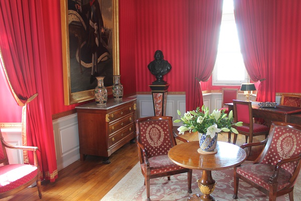 Visito, entonces, el castillo, junto al que flamean una fila de banderines. Las habitaciones de los monarcas son suntuosas, pero no excesivamente grandes. Hay aposentos reales cuyas paredes han sido cubiertas por vistosa seda roja. Los retratos de algunos de los moradores del castillo ocupan paredes, junto a vistosos jarrones, cornucopias y secreteres. Las camas de los dormitorios, cubiertas por baldaquinos, son el único territorio en donde existía una cierta privacidad que no existía en los aposentos comunicados unos con otros, territorios de paso, porque a nadie se le había ocurrido inventar el pasillo.