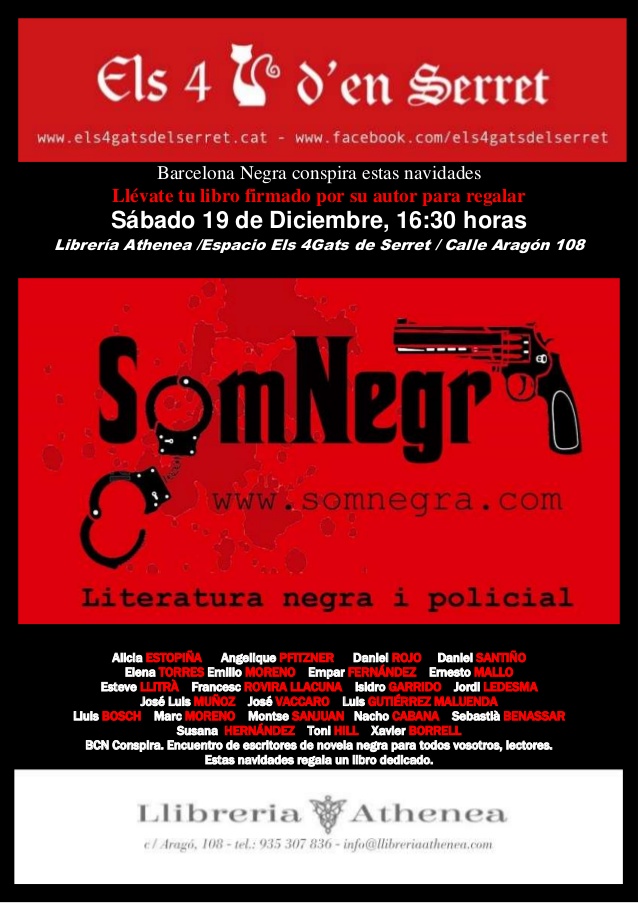 Marta Mirosa, que hace muy pocos meses ha abierto la librería Athenea, dice al respecto de este acontecimiento literario: “En una librería, en donde las palabras que se entremezclan buscan pacientemente ser devoradas por un lector, no podían faltar aquellas que se agrupan en lo que conocemos como género negro. De la mano de promotores como Serret o SomNegra, la nueva Athenea –renacida por segunda vez del cerebro del dios de los dioses- tiene el placer de acoger este oscuro, y a su vez brillante, encuentro de escritores de literatura negra. Promete ser un sábado vibrante, repleto de talentos cuyas plumas llenan páginas impregnadas de distopía, erotismo, crónicas de sociedades en crisis, tétricos rincones del alma humana… Porque ellos nos hablan de moral, la alzan o descuartizan, la exponen y diseccionan, pero jamás moralizan. No se dan muchos sábados como este: un momento, un lugar, un ambiente y una gente que me recuerda aquella frase de Marlon Brando: “He visto un caracol, se deslizaba por el filo de una navaja, ese es mi sueño, más bien mi pesadilla, arrastrarme, deslizarme por todo el filo de una navaja de afeitar, y sobrevivir.”