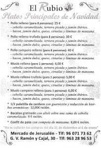 Si vives en Valencia y no te apetece cocinar, te aconsejo que pases por El rubio casa de comidas para llevar. Tienen unos menús navideños riquísimos y a buen precio. Si eres poco comedor, tienes una selección considerable de recetas sabrosas. Además, hay precios para grupos; no se puede pedir más. Os dejo la carta para que se os haga la boca agua. 😉