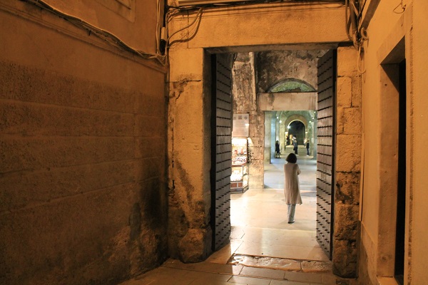 El subterráneo del palacio de Diocleciano es un dédalo impresionante de enormes estancias separadas por muros del grosor de tres metros, comunicadas todas entre sí. Una parte es museo y la otra, la central, un zoco en donde se vende de todo, baratijas principalmente. Las columnas, cuadrangulares, carecen del más mínimo cariz ornamental y no tienen más función que aguantar el suelo del palacio. En una de las inmensas y áridas estancias subterráneas, construidas con sillares gigantescos inalterables al tiempo y a la humedad, el busto de un altivo Diocleciano barbado, que nació y murió en tierras croatas (Solin, 244-Split, 311), contempla desde el pasado al hombre del presente.