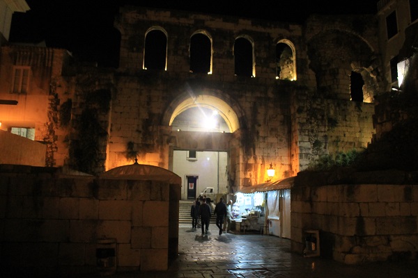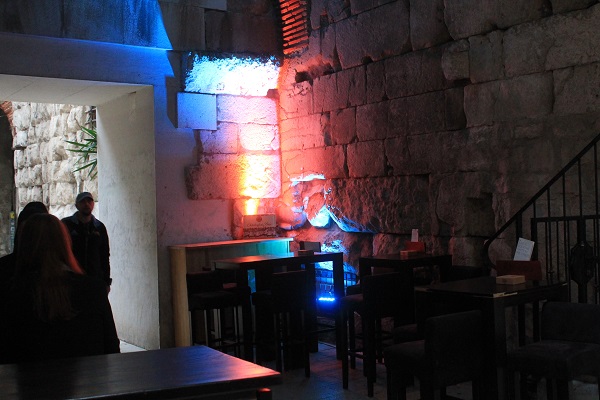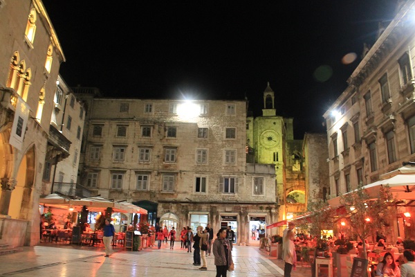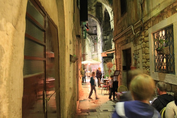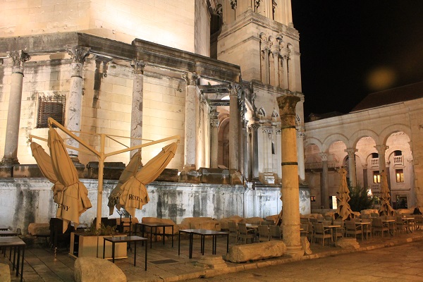 Pegado a un muro y un arco romanos, descubro un bar de copas que los aprovecha para proyectar sus luces psicodélicas en sus paredes, y los jóvenes abundan tanto en él como en otros lugares de ocio, atraídos por la belleza del centro histórico de la ciudad. En las escalinatas de la catedral, que ocupa el ágora del palacio de Diocleciano, el café Lúxor, enmarcado por una serie de seis esbeltas columnas romanas y sus arcos, ha puesto cojines para que sus clientes degusten su vino dálmata entre tan impresionantes vestigios del pasado.