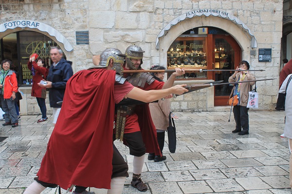 Aprovechando la acústica de una bóveda adjunta, un coro de cantantes dálmatas da un recital de música popular del país aunando su decena de voces graves, a capela, y el público escucha, fotografía, grava la actuación y hasta compra los CD que venden por 100 kónecs, unos 15 euros. Y, como en el Capitolio romano, hay dálmatas disfrazados de soldados romanos que posan para los fotógrafos en actitudes belicosas, lanza en ristre.