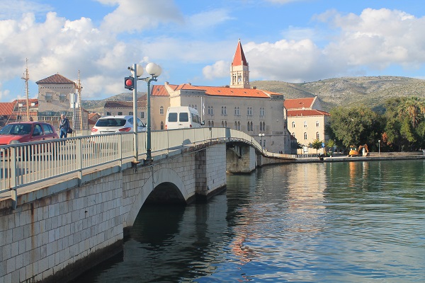 Trogir está a orillas del mar, rozándolo. Dejo el coche en un aparcamiento, pasado un puente levadizo de tres ojos que cruza un canal, en su puerto deportivo, junto a lanchas y fuera bordas que se balancean en un mar tan azul como el cielo, y me aventuro por la población siguiendo la guía del espigado campanario, una aguja que me sigue recordando a los minaretes de las mezquitas: unos y otros, mediante campanas o por la viva voz de los muecines, sirven para llamar a la oración.