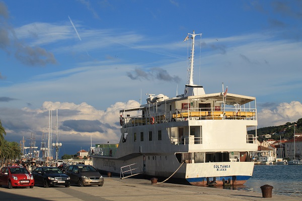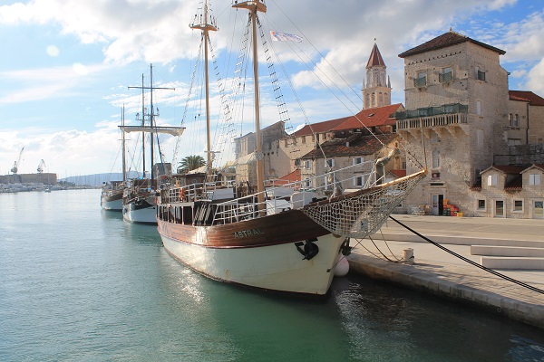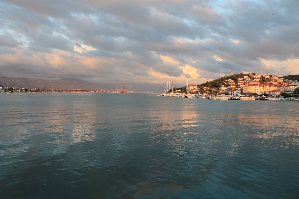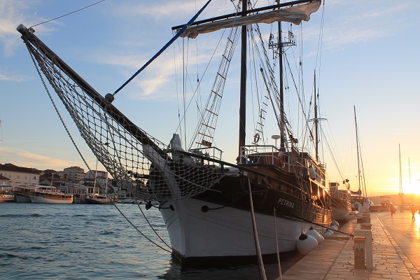 Salgo por la puerta romana cuando el sol agoniza con un fogonazo de belleza que se refleja en las aguas del puerto y en los barcos que hay amarrados. El Petrina es uno de esos grandes y nobles navíos anclados en Trogir que puede dar la vuelta por el Adriático y asomarse al Mediterráneo. Unas nubes oscuras, de un gris plomizo, pintan el cielo y el agua del mar del mismo color, mientras la luz que las atraviesa centellea en las casas de la población. Cuando se pone el sol regreso a mi hospedaje arrastrando la maleta por ese suelo blanco que no acaba de perder su luminosidad aunque el astro rey se haya ido a dormir bajo la marina línea del horizonte.
