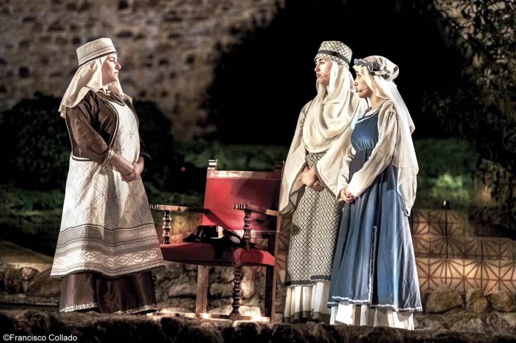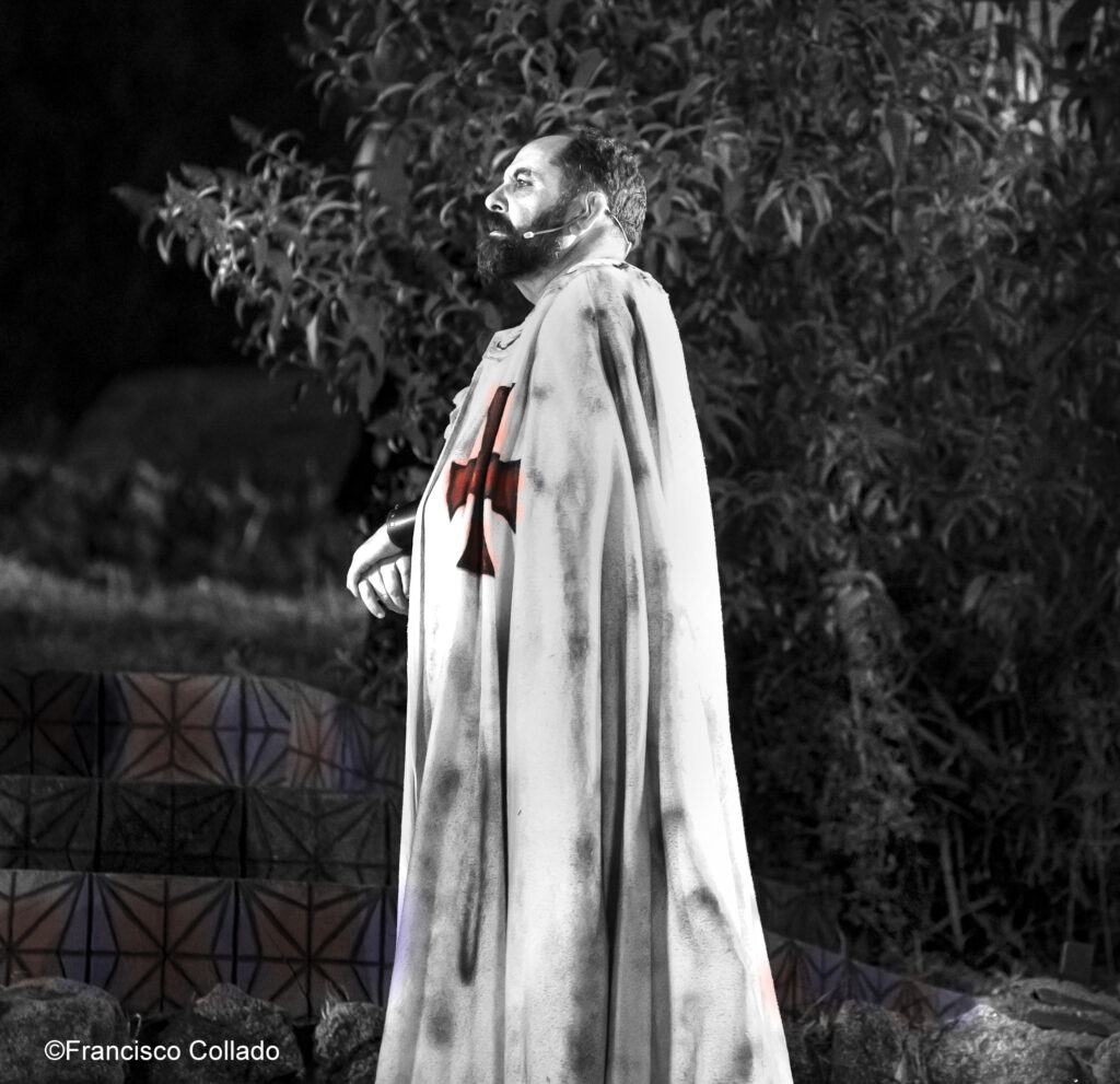 El director, Pablo Pérez de Lazárraga dota al conjunto de un disfraz de gran espectáculo, pero sin dañar la textura íntima de los personajes, ni el hecho dramático. De eso también se encargan un conjunto de solventes actores cuyo dominio escénico sobre el envidiable entorno del Parque de Popagallina, eleva en muchos quilates el nivel de la obra. Muchos de ellos podrían militar en compañías profesionales. Destacar los roles de la reina María de Molina (Silvia Carrasco); mujer fuerte de la época; convincente y asentada en su desarrollo o la profetisa ciega Sibila (María Ángeles Sánchez), de amplia proyección vocal. Acertados en sus personajes están el arzobispo; casi extraído de un códice medieval; el Maestre del Temple Jerezano, acertado en su juventud y arrojo o el templario felón (Francisco Albel Vellarino) que traiciona a los suyos. Sería injusto no mencionar a los más de cien voluntariosos actores, especialmente los niños, que dotan de vida a los diversos cuadros, acertados y esforzados en sus breves instantes, dese las lavanderas a los mercaderes, cuyos nombres no puedo citar dada la escasa información y la ausencia de Dossier sobre el espectáculo, pertenecientes a la Asociación “Jerez a escena”.