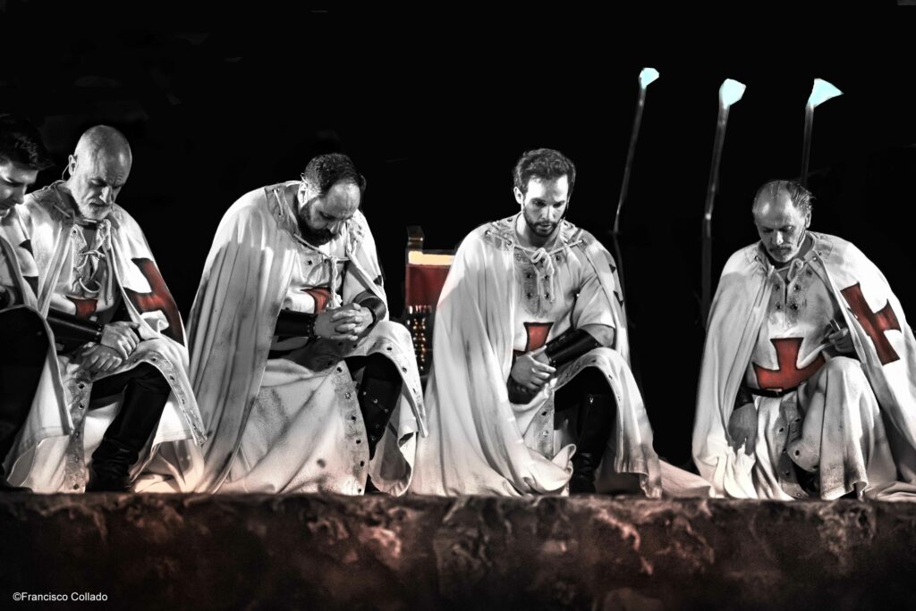 Las coreografías y los cambios de escena son claros, de gran naturalidad y agilidad, con enorme belleza en algunos cuadros como los del jubiloso mercado, las composiciones de los caballeros templarios arrodillados rezando o el desfile espectral con antorchas. El espacio escénico es aprovechado en toda su histórica belleza, Apoyada en una notable luminotecnia de saturada querencia naif, que habita tanto en el elaborado vestuario como en lienzos de murallas y orografía, resaltando el entorno y construyendo verdaderos tableaux vivants. El excelente vestuario navega entre las albas capas templarias, con su cruz paté, las sayas del pueblo y las ornamentadas vestimentas de la realeza y la alta Iglesia.