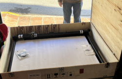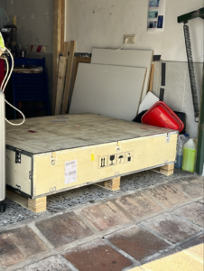 Fig 2. Embalaje profesional desde China: la máquina llega perfectamente protegida sobre palets de madera, garantizando integridad estructural durante el transporte internacional.