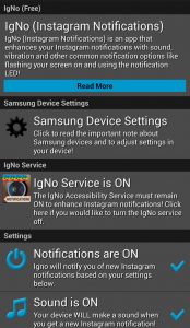 - IgNo Free (Android): una de las mayores carencias de Instagram es que no tiene notificaciones, es decir, que si tienes un “me gusta”, un seguidor nuevo, una mención…, tu Smartphone no te avisará. Si eres de los que no les gusta estar pendiente todo el rato del móvil, esta app hace que cada vez que haya alguna interacción nueva en Instagram te suene una notificación para avisarte. Además, puedes personalizar el tono con los sonidos que tenga tu Smartphone.