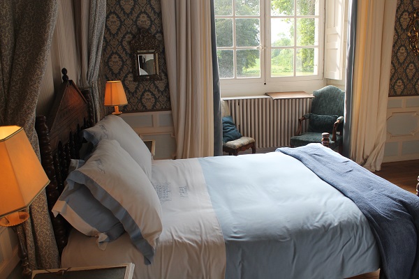 Los dormitorios son espaciosos y luminosos, con las paredes cubiertas de tela, camas grandes (ignoro si los señores, como hacían los antepasados, duermen juntos o bien lo hacen en camas separadas) y modernos cuartos de baño integrados. Duermen juntos: hay dos juegos de almohada y dos butacones, junto a la ventana y el radiador, por si les apetece leer a la luz natural del día. Hay un dormitorio, más solemne, con baldaquino sobre cuatro columnas salomónicas de madera, seguramente para huéspedes ilustres.