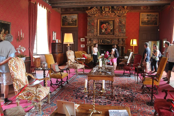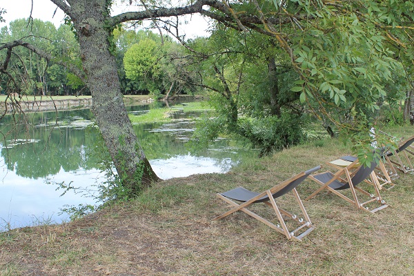 La visita es guiada. Así es que hay que esperar hasta que toque una campana a las cinco de la tarde. Pero Pierre-André y Bénédicte Michaud, hay que reconocerlo, son muy amables porque han dispuesto a lo largo del canal del río Indre, en donde nadan patos y cisnes, bancos de madera y cómodas tumbonas para que los visitantes se relajen bajo la sombra de los enormes árboles de su jardín o se pierdan, paseando, por los bosques de su propiedad, o se echen, sin más, sobre la hierba, a echar un sueñecito. Y del sueño me expulsa el campanillazo a las cinco, así es que me levanto, me restriego los ojos, doy un bostezo y cruzo el río Ingre por un rústico puente de madera sobre dos pilones.