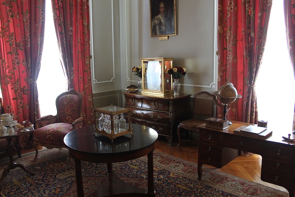 La sala de música era la femenina, adonde se retiraban las damas con sus abanicos a escuchar como un virtuoso tañía la enorme arpa que hay en el suelo. Una pareja de bailarinas, esculpidas en madera policromada, agita su corona de triunfo y muestra una pierna escoltando el retrato de una aristócrata que vuela sobre la chimenea. La decoración es discreta y suave, con las paredes grises azuladas y adornos geométricos. Un enorme espejo permite a las damas repasar sus tocados.