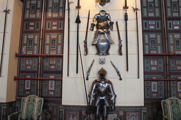 La Sala de Armas es una de las estancias cruciales. Aquí se reunían los machos de la familia a rememorar sus escenas de caza, ahora, sus batallas, antes. El techo está cruzado por vigas y viguetas a la vista, profusamente decoradas con cuadros y medallones con marcos dorados, sin dejar un solo espacio libre. Sobre la chimenea, Mercurio y Venus, esculpidos en madera dorada, enmarcan la historia de amor de Adonis. No es el único motivo clásico de la sala. Tapices con escenas de la Iliada y la Odisea, y del rapto de Helena, decoran las paredes. Hay mandobles, espadas, alabardas, cuchillos, pistolas, armaduras, toda la panoplia antigua militar.