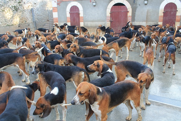 No termina mi visita con ese helado en la Orangerie. La posesión se extiende, fuera del palacio, nada menos que por cien hectáreas de bosque por donde corren ciervos y jabalíes con el único fin de ser cazados. Y ahí entran los cazadores, los dueños del castillo y sus invitados, perfectamente uniformados sobre sus caballos andaluces que no se ven. A unos doscientos metros de la construcción palaciega encuentra el visitante la perrera. Una jauría de unos cien perros se amontona en poquísimos metros cuadrados; los canes ladran constantemente, se enseñan los dientes y se montan unos a otros, en un espectáculo que hiela la sangre. Los perrazos sabuesos son gigantescos e imagina uno lo poco que duraría si cayera en sus dientes. Lo mismo que duran los ciervos y los jabalíes cuando son rodeados y despedazados, sin alternativa, por la feroz jauría. Entiendo, en directo, el término jauría y su connotación peyorativa de avidez por la sangre. No hay el más mínimo rasgo amistoso en ese centenar de canes hacinados que esperan que los suelten para ejercitar su primitivo instinto depredador. Por si alguien alberga alguna duda, un letrero advierte que los perros están muy saludables, que no están estresados, que se les alimenta adecuadamente y que se les asea a diario. Nadie lo diría. Están, valga la expresión, de un humor de perros.