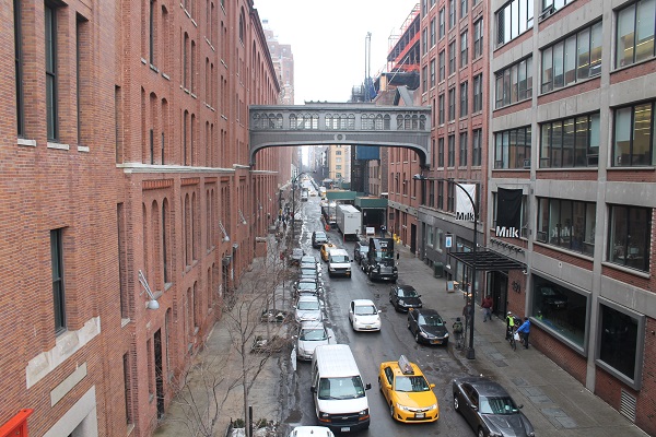 Queda mucha nieve por la zona, pero la frialdad de ese manto blanco, que se endurece por el frío hasta convertirse en resbaladizo hielo, no arredra a un músico negro que percute con las palmas de sus manos un par de bongos y parece que no vaya a dejar de tocar en toda la tarde. Pasamos, en nuestro recorrido aéreo por el High Line, por un moderno edificio de fachada metálica ondulada, inspirado en las obras arquitectónicas de Frank Ghery; por encima de aparcamientos verticales en plataformas que se elevan con el coche y un hangar al que van a parar los vagones del metro que tienen que ser reparados, porque el metro en Nueva York, con todas las deficiencias en cuanto a su limpieza y conservación, funciona las veinticuatro horas y lleva al pasajero a los lugares más extremos de la ciudad.