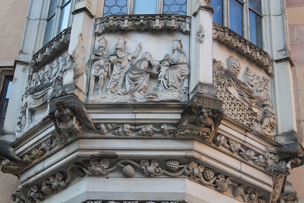 Enfrente de la iglesia de San Sebaldo, en la misma plaza, descubro otra de las joyas de la ciudad, el historiado balcón gótico renacentista, con rica ornamentación de altorrelieves, que pende de la fachada del Stadtmuseum Fembohaus, de cinco caras, completamente cerrado y sustentado por una gruesa columna a tierra firme de modo que más que de un balcón podríamos hablar de un púlpito sin predicador.