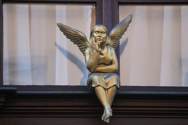 Sigo mi paseo errático por la ciudad, sin mapas y con instinto, porque callejeando sin rumbo es cómo mejor se conocen. Desciendo por una serie de calles hacia la plaza del Mercado. Siempre, si miro hacia arriba, tengo alguna sorpresa agradable. Un ángel dorado, con ropa de estar por casa y las piernas cruzadas, está sentado en el alfeizar de una ventana de una casa en actitud pensativa y con los ojos entornados. El sello de un cisne adorna un inmueble de 1563. Paso por un restaurante, cerrado, de cocina española. No será el único.