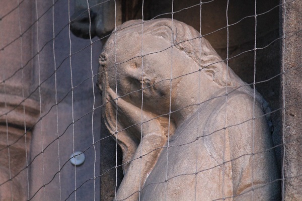 No hay mucha gente por la calle este domingo 1 de noviembre y ni un solo joven; la resaca de la noche de difuntos debe de tener que ver con ello. La luz del sol me permite disfrutar de la portada extraordinaria de la iglesia luterana de San Lorenzo, enmarcada por sus dos altísimas torres y presidida, en la columna que divide en dos la puerta principal, por la Virgen y el Niño, y de las esculturas de piedra que pueblan su arco, entre las que distingo a Adán y Eva escoltados entre profetas y protegidos por redes de las malignas palomas que no veo en la ciudad. Sobre la Virgen, una serie de tímpanos con relatos sacros y un reducido Cristo crucificado. El interior de la iglesia me lo veda un portero de discoteca que está allí para impedir que entren turistas y conturben con sus cámaras el sacro oficio que tiene lugar a hora tan temprana, y puedo dar fe de que el servicio de orden en las iglesias es sumamente eficaz: a una mujer casi la placaron cuando sacó su cámara de fotos sin saber que había una ceremonia religiosa.