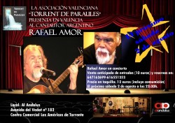 El próximo sábado 2 de agosto, y directamente llegado desde Argentina, el poeta y cantautor Rafael Amor, ofrecerá un concierto en el local Al Andalus del centro comercial Las Américas, de Torrente. Gracias a la brillante gestión de Patricia Cuenca al frente de «Torrent de paraules», los asistentes al concierto podrán disfrutar de una de las leyendas de la canción protesta latinoamericana. Rafael Amor, hará gala de su extenso repertorio y recordará los mejores momentos de una carrera llena de lirismo y reivindicación que lo ha llevado a colaborar con artistas como: Mercedes Sosa, Alberto Cortez o Los Sabandeños.