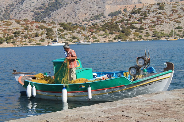 Hoy ese barco que ha cogido no tiene baño en mar abierto incluido sino calor insoportable, y busca Ulises refugio bajo la toldilla de popa. No se mueve del asiento hasta que el barco entra en Symi y atraca junto a otros barcos. Si en Rodas sopla una brisa que hace soportable el calor, en Symi Helios domina el ambiente sin piedad y cada paso que da por el muelle requiere un esfuerzo considerable y la ayuda de bebida. Más por calor que por hambre, busca un restaurante junto al mar. El calor del ambiente multiplica las moscas, que son pequeñas, y enloquece a algunas avispas que buscan beber su cerveza. La ensalada griega es copiosa pero ya empieza a cansarse del queso feta. Los calamares, correosos. Lo mejor la cerveza Alfa que el dueño del restaurante, de sus misma edad y muy amable, le va trayendo según las acaba.