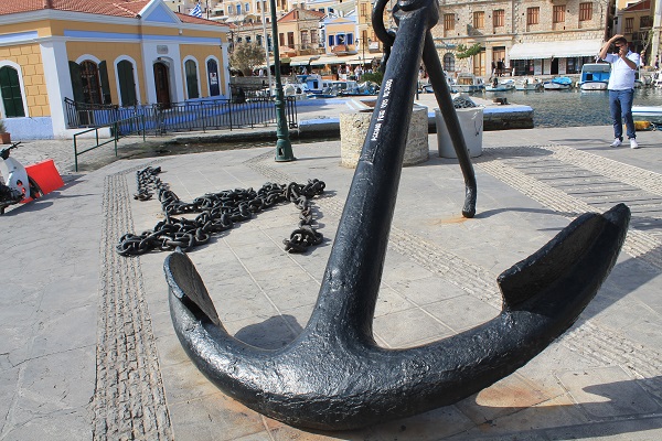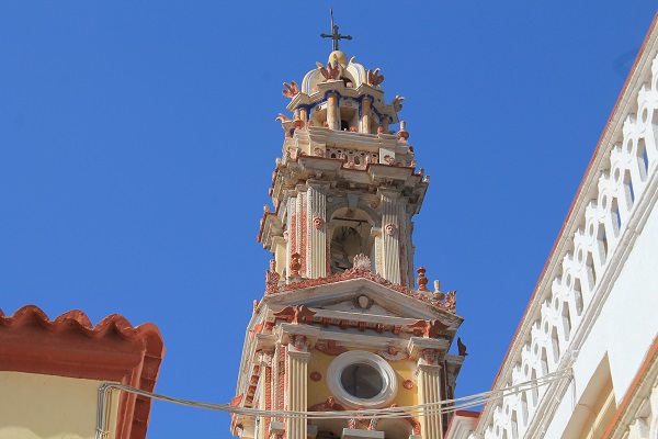 El barco hace una parada en el monasterio de Panormitis, y, cuando entra en la bahía, hace sonar su estridente sirena que es contestada por un batir de campanas del monasterio. El recinto religioso, que tiene a su alrededor un complejo de apartamentos de discreta altura, una tienda de souvenires y un bar de autoservicio, es todo lo opuesto al retiro espiritual que se le supone a un cenobio. Los barcos cargados de turistas entran y salen en sesión continua y vomitan sus cargas de turistas que disponen de una hora antes de que levanten anclas. Una mujer, a la entrada del monasterio, examina las piernas de las mujeres (los hombres estamos al margen de ser objeto de tentación) y colocan faldones a las más osadas ante la mirada de un pope gordo y barbudo que observa a esa masa gregaria con desprecio pese a que supone la principal fuente de financiación del monasterio.