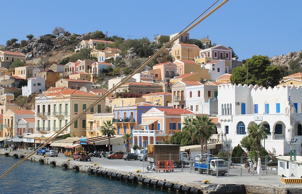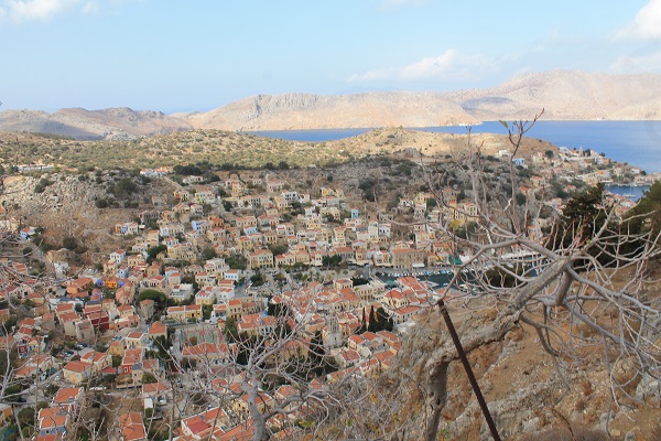 Symi alinea sus casas blancas, color pastel y añil, con forma de templo helénico, en las empinadas laderas de la bahía. No es un capricho sino una necesidad. Buscando una buena panorámica, asciende por calles escalonadas hasta que se da cuenta de que las escaleras son el elemento distintivo de la población. Culminada la cuesta, el inquilino de esas casas que va dejando atrás con enorme esfuerzo, aplastado por Helios, el dios más poderoso del Egeo, tiene que subir empinadas escaleras para acceder a su vivienda y, dentro de ella, más escaleras para ir de una habitación a otra.