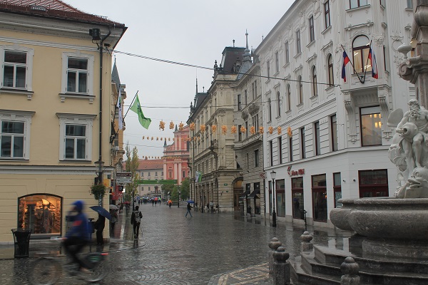 Llueve de una forma suave, así es que paseo por las calles peatonales que corren paralelas al río y me concentro en la edificación civil de la ciudad, sus casas hermosas en cuyos bajos hay comercios, restaurantes u hoteles, con fachadas pintadas en colores pastel, típicos de Centroeuropa, porque Eslovenia ha recibido el influjo de Italia, Austria y Hungría. Liubliana, con solo 270.000 habitantes, me recuerda a Varsovia o a alguna de las capitales bálticas visitadas el año pasado. En donde ahora está la ciudad, se enclavaba la colonia Iulia Emona, el campamento romano, en el siglo I. La ciudad, además, en esta época del año, es sumamente tranquila. Así es que disfruto de una edificación armónica, con edificios del siglo XIX, firmados muchos de ellos por el arquitecto Joze Pleknic, hasta que el hambre me aguijonea alrededor de las cinco de la tarde.