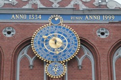 Se puede recorrer ese casco antigua siguiendo las torres bulbosas de sus iglesias góticas de ladrillo que sobresalen y te orientan. La más espigada es la de San Peter, de culto luterano y estilos románico, gótico y barroca, de austera fachada de ladrillo, que la remata un gallo dorado, en la plaza del mismo nombre, cercada por feos edificios. Unos pocos metros a la derecha, en la plaza del consistorio de la ciudad y junto a la oficina de turismo, el visitante encuentra La Casa de la Cabeza Negra, curioso nombre que no lo es tanto en cuanto uno comprueba que en una de las columnas de esa noble edificación, hoy museo, de fachada escalonada de ladrillo y adornada por esculturas de bronce, una de ellas sin duda Neptuno con su tridente, hay dos falsas columnas que abrazan su puerta principal con dos figuras policromadas, una virgen con su hijo en brazos y un abanderado negro, la cabeza negra a la que hace referencia el nombre de la casa. Qué hace ese soldado negro con un historiado uniforme del ejército del siglo XVIII, casaca, medias y tricornio, en las filas de un ejército eslavo es un misterio.