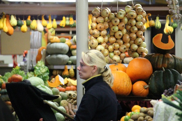 Si se quiere pulsar la vida de la ciudad, en la que no hay comercios de comestibles más que algún pequeño quiosco en el parque, que se confunde con los váteres públicos, o en las avenidas más concurridas, hay que ir al mercado. El mercado central, junto a la vía del tren y la estación de autobuses, es una de las mayores atracciones de la ciudad. Cinco enormes hangares, cuatro de ellos comunicados, albergan todos los alimentos que uno pueda necesitar. El primero de ellos está dedicado única y exclusivamente a los lácteos (quesos de muchas variedades, uno con aspecto del delicioso mató de Montserrat algo más tosco, yogures a granel, enormes recipientes de nata montada, litros de leche fresca recién ordeñada, toda clase de dulces); el segundo a los vegetales (calabazas, tomates, pepinos diminutos, melones, manzanas de todas las clases, plátanos de Ecuador, zanahorias sucias de tierra junto a otras lavadas, coles inmensas, coliflores reducidas, patatas de todos los tamaños, remolachas para sus sopas, cebollas, pocos ajos, algunos chiles); el tercero a la carne (cerdo, vaca, pollo, mucha carne y mucho embutido ahumado); el cuarto al pescado (salmón, caviar de salmón, platijas, esturiones, ni un solo pulpo, gamba, cangrejo ni nada que se le parezca, pero eso sí, una enorme variedad de ahumados) y el quinto a más verduras (éste es un país con una enorme riqueza agrícola, muy apto por el cultivo por la cantidad de ríos que surcan tierras completamente llanas sin elevación alguna) y a semillas. Y entre esos hangares concurridos, al aire libre, más puestos de verduras y frutas con naranjas, endrinos, frambuesas, fresas y flores.
