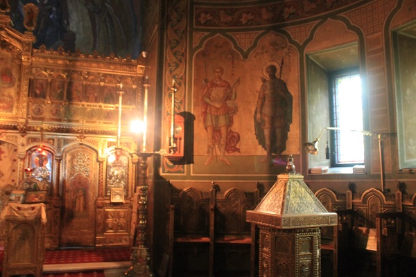 El interior es peculiar, de planta de cruz latina, algo muy atípico en Rumanía, y con ábsides rectangulares. La iglesia mide 15 metros de largo, 6 de ancho y 15 de alto. Los muros tienen una anchura de un metro y la disposición de los frescos sobre ella es perfecta, adaptándose a las irregularidades de las paredes, sin dejar un solo resquicio sin pintar. En el iconostasio hay un relicario que es un altorrelieve de plata que representa a la virgen con el niño Jesús; otro es un Jesús adulto. Ulises disfruta del placer solitario que le depara esa iglesia, toma asiento en la única silla dispuesta para los admiradores de tal obra de arte y permanece unos minutos en silencio, en recogimiento, en esa pequeña capilla Sixtina del arte bizantino. Nunca tanta belleza en tan poco espacio.