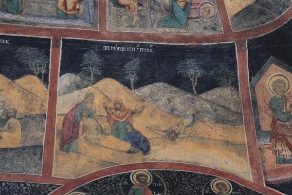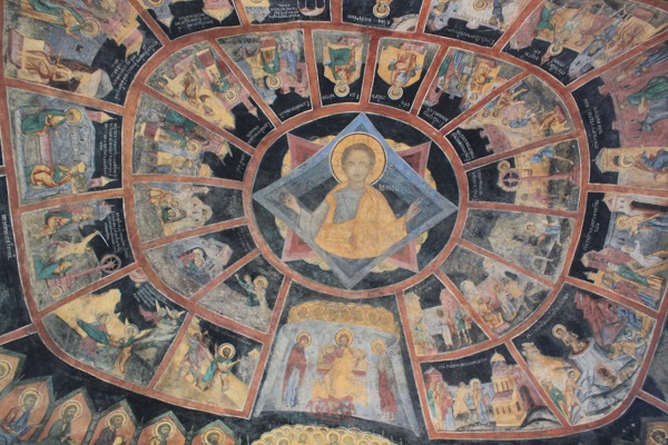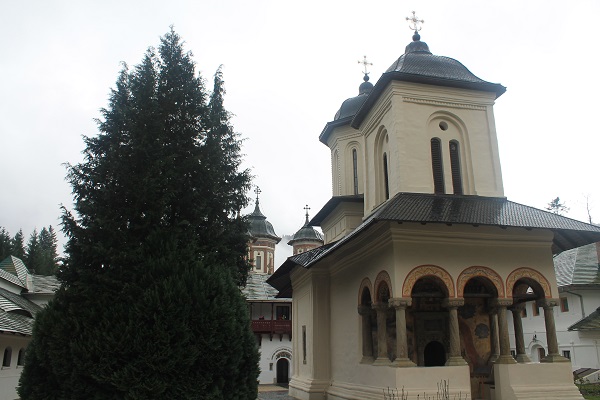 Llovizna cuando sale. Hay una dependencia aneja al monasterio central y Ulises investiga. Su curiosidad tiene recompensa. Un claustro cuadrangular, que alberga las celdas para los visitantes que quieran quedarse y las de los popes del monasterio, encalado de blanco, rodea a una diminuta iglesia, la de la Ascensión de la Virgen María, la genuina del recinto monacal, construida entre los años 1690 y 1695 por el noble Mihail Cantacuzino, de peregrinaje a Tierra Santa y que pasó por la zona. La iglesia es del viejo estilo valaco, el llamado brancoveanu, de fachada blanqueada, tejado de pizarra a cuatro aguas y una única cúpula lucernario rematada por una cruz dorada. Su nártex cuadrado y flanqueado por ocho columnas, que aguantan siete arcos de medio punto, está decorado con extraordinarios frescos de Parvu Matu, el gran maestro de los pintores de iconos rumanos. Unas pinturas secuenciales y dispuestas en tres círculos, que rodean un curioso Pantocrátor de un Jesús sin barba, y parece el tablero de un juego de mesa, decora la bóveda. Los iconos de la parte central son de una ejecución exquisita, y otro sinfín de iconos sobrevuela la puerta de entrada de la iglesia e incluso decoran los arcos.